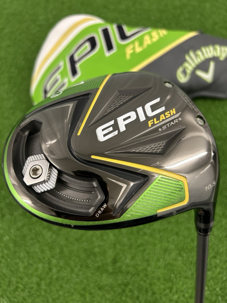 This Callaway Epic Flash Star driver is in good overall condition. There are minor cosmetic marks on the crown, including a minor scratch on toe end of the crown as well as a small cosmetic paint chip mark towards the hosel – highlighted in the last picture of the listing. The driver features a stiff flex Fujikura Speeder Evolution graphite shaft and has a playing length of 45.75 inches. The headcover is included.