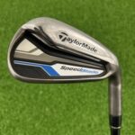 This TaylorMade SpeedBlade High Launch #5 iron is in good overall condition. There are minor cosmetic marks on the club head and club face from standard use. There is a minor scuff mark on the graphite shaft – highlighted in the last picture of the listing. The iron features a uniflex TaylorMade SpeedBlade 65 Gram graphite shaft and has a standard playing length of 38.25 inches.