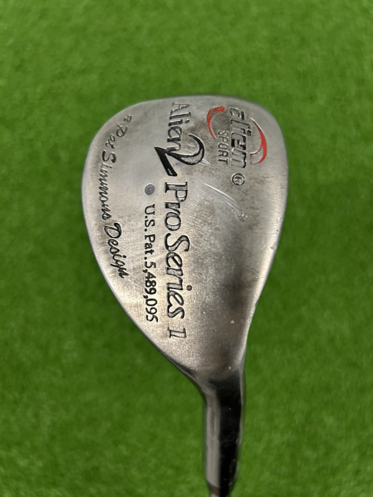 This Alien Sport Alien 2 Pro Series 1 sand wedge is in good overall condition. The club head does show the signs of regular use with cosmetic marks, as well as strike marks on the club face and sole. There is a scuff mark on the club sole – highlighted in the last picture of the listing. The wedge features a steel shaft with a playing length of 35.75 inches. The shaft label is missing.
